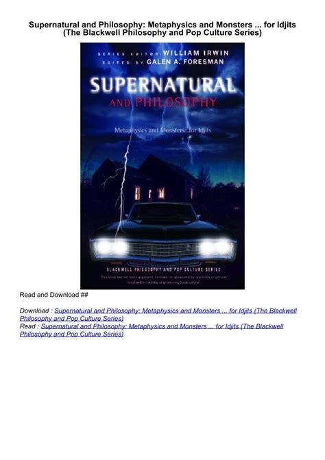 Free Download Supernatural and Philosophy Metaphysics and Monsters... for Idjits Reader By Click Button. Supernatural and Philosophy Metaphysics and Monsters... for Idjits it’s easy to recommend a new book category such as Novel, journal, comic, magazin, ect. You see it and you just know that the designer is also an author and understands the challenges involved with having a good book. You can easy klick for detailing book and you can read it online, even you can download it